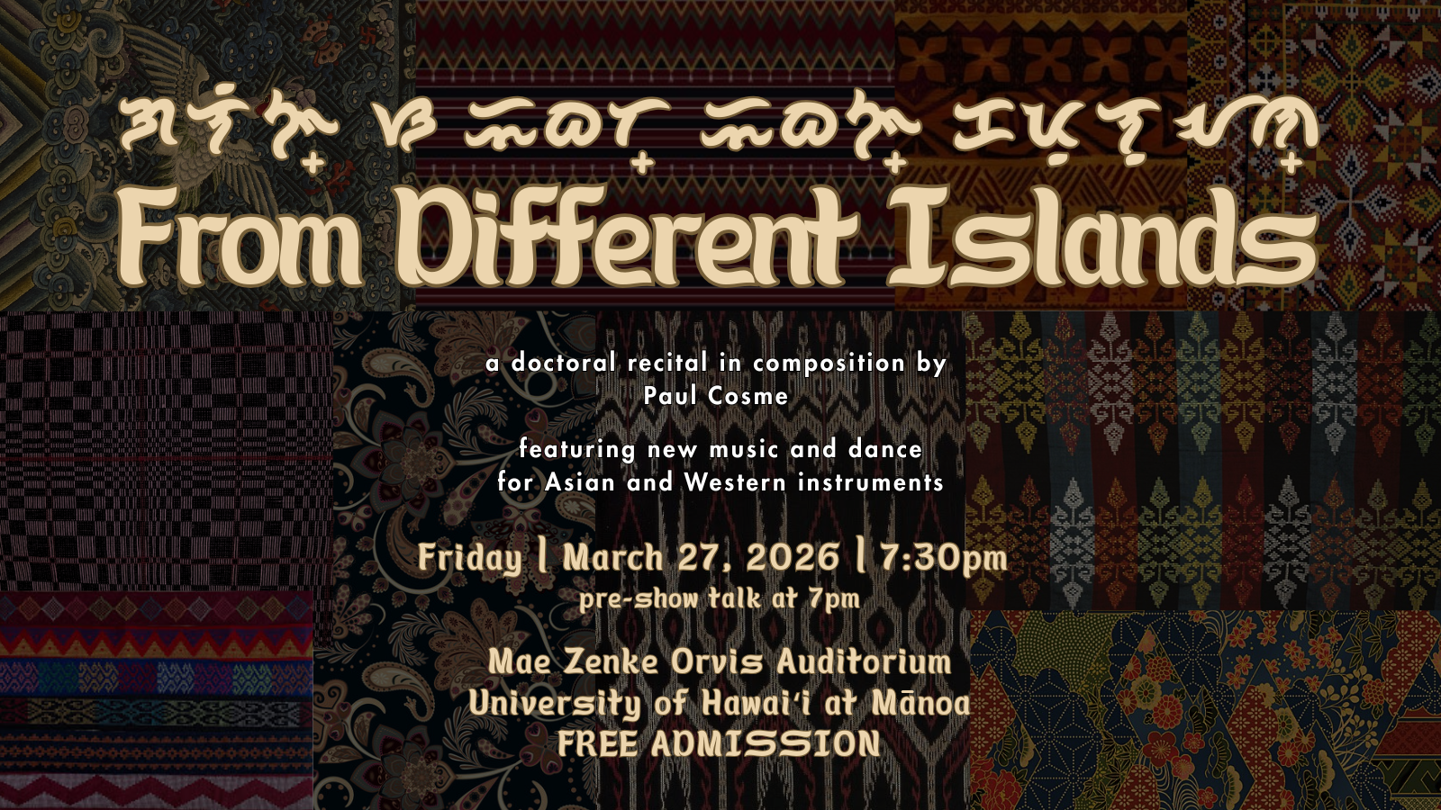 I would like to invite you to my doctoral recital in composition, entitled From Different Islands. The recital program is composed of new music and dance for Asian and Western instruments that explore fusions and break boundaries (the good kine!).